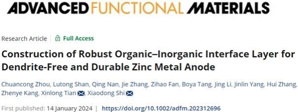 近日,伟德官网史晓东副研究员所在团队在材料领域Top期刊Advanced Functional Materials (IF=19.0)发表题为《Construction of robust organic-inorganic interface layer for dendrite-free and durable zinc metal anode》的研究论文。伟德官网周传聪博士、曼彻斯特大学单路通博士为论文共同第一作者,伟德官网史晓东副研究员、田新龙教授为论文共同通讯作者,伟德官网伟德官网为第一通讯单位。
