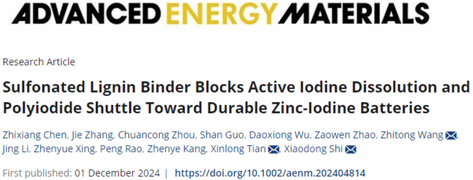 12月1日,史晓东副教授所在团队在能源领域顶级期刊Advanced Energy Materials发表题为“Sulfonated Lignin Binder Blocks Active Iodine Dissolution and Polyiodide Shuttle toward Durable Zinc-Iodine Batteries”的研究论文。伟德官网研究生陈志祥(研二)、张杰(研三)和周传聪博士(博四)为论文共同第一作者,史晓东副教授、王志同副教授和田新龙教授为论文共同通讯作者。